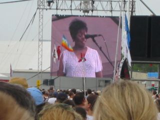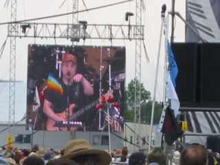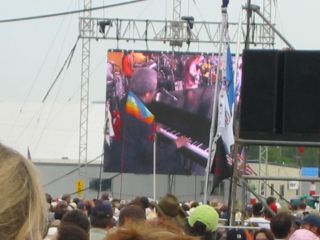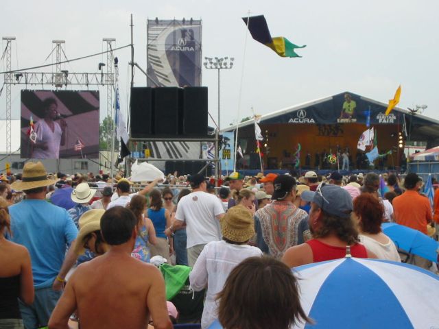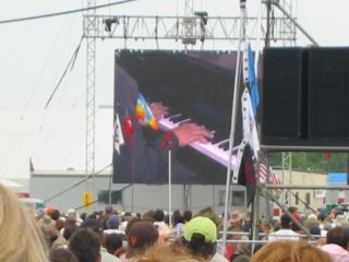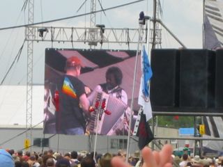 Paul Simon's set, as seen on the Acura Stage video screen: Paul; with Buckwheat Zydeco; Irma Thomas sitting in; Allen Toussaint on piano; Allen's fingers; group bow |