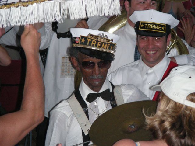 'Uncle' Lionel Batiste of the Treme Brass Band, as the band second-lines thru the Economy Hall Tent | ![]() |