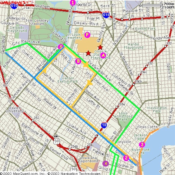Here's a hint if you leave using the Stallings Playground location (A on the map). To get on line, you will be directed into the playground at the corner closest to Fest. The line will eventually lead back out onto Gentilly, where they will load cabs from a half dozen spots along the curb. Once you get through the gate back onto the street, listen for the taxi folks to shout out to "move down", then move past the folks waiting at the first few spots, down to the end closest to where you entered the playground. Folks who don't know the procedure always back the line up for the first 2 spots, so groups that move down to the other end will save some time.